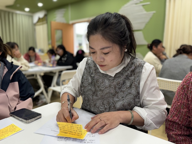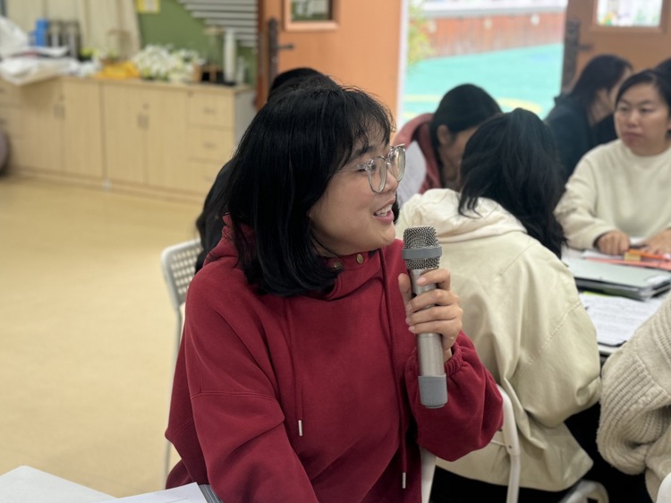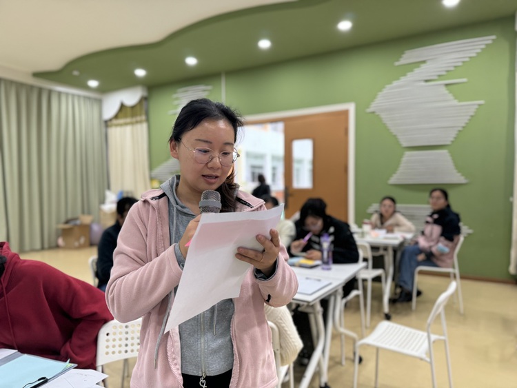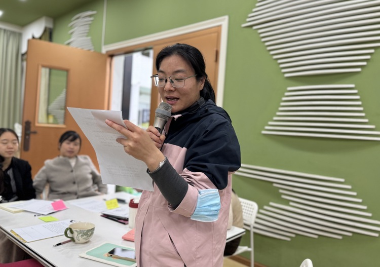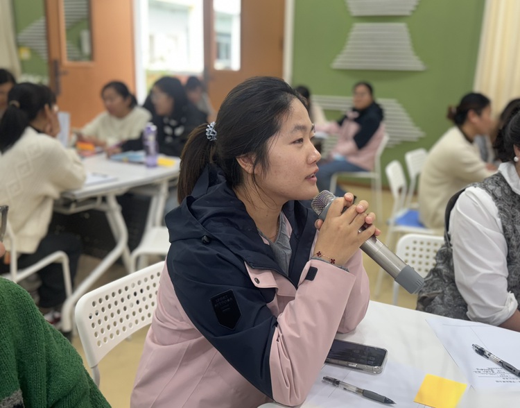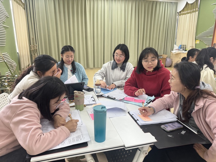 随后,教师们以小组为单位轮流分享记录内容,相互交流想法,深入了解幼儿在游戏中的思维过程、经验运用与发展需求,以便更好地支持幼儿后续的游戏。