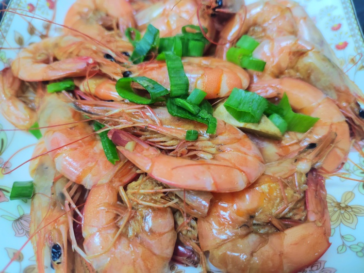 白米饭、红烧明虾、白花菜炒胡萝卜、萝卜仔排汤