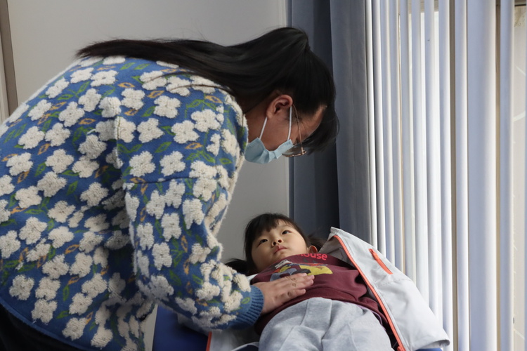 保健医生询问老师幼儿进餐情况,查看幼儿体征,询问详情、检查体温和腹部。